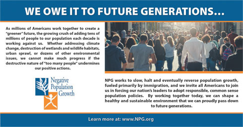 NPG works to slow, halt and eventually reverse population growth, fueled primarily by immigration, and we invite all Americans to join us in forcing our nation's leaders to adopt responsible, common sense population policies. By working together today, we can shape a healthy and sustainable environment that we can proudly pass down to future generations.