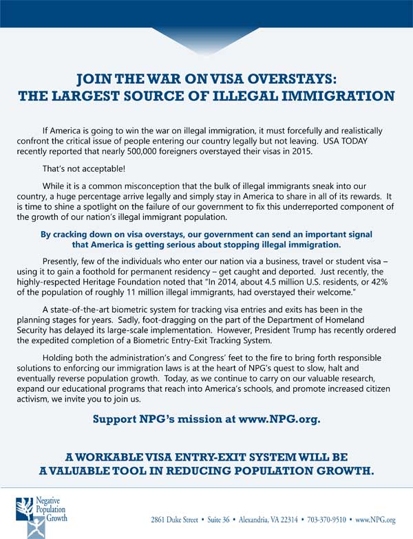 Holding both the administration’s and Congress’ feet to the fire to bring forth responsible solutions to enforcing our immigration laws is at the heart of NPG’s quest to slow, halt and eventually reverse population growth. Today, as we continue to carry on our valuable research, expand our educational programs that reach into America’s schools, and promote increased citizen activism, we invite you to join us.